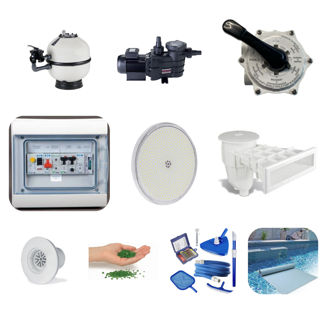 • 1 Kit accessori di manutenzione: Kit accessori di manutenzione comprensivo di manico telescopico, retino di superficie, retino di fondo, termometro, spazzola aspirafango, spazzola di fondo, tubo galleggiante, kit test.